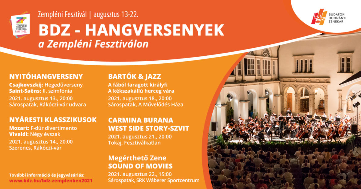A Budafoki Dohnányi Zenekar a Zempléni Fesztivál rezidens zenekaraként több izgalmas, újszerű, szórakoztató hangversenyre várja a fesztiválközönséget. A hagyományoknak megfelelően a fesztivált a BDZ nyitja meg augusztus 13-án. A nyitókoncerten Lendvay József közreműködésével Csajkovszkij hegedűversenyét hallhatják elsőként, illetve Saint-Saëns II. szimfóniáját.