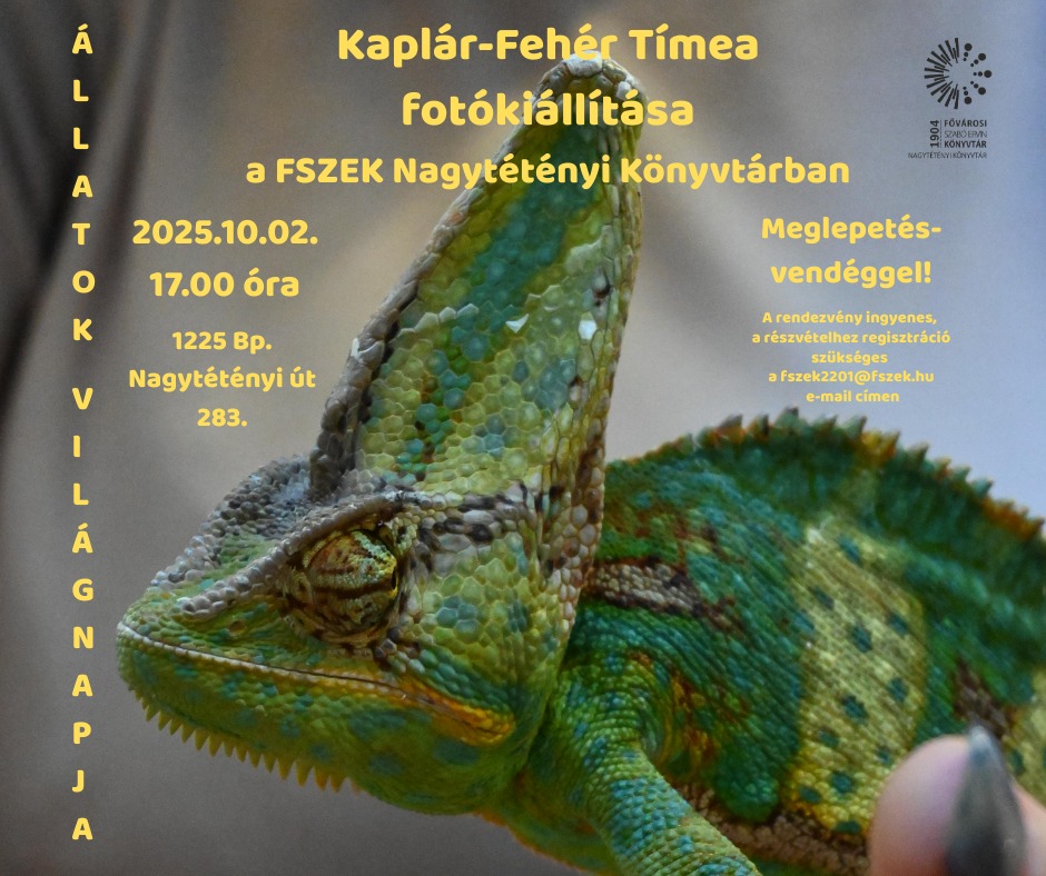 Kaplár-Fehér Tímea fotókiállítás-megnyitója az állatok világnapja alkalmából a FSZEK Nagytétényi Könyvtárban 2025. október 2-án, csütörtökön, 17.00 órakor. Meglepetésvendéggel is készülnek.