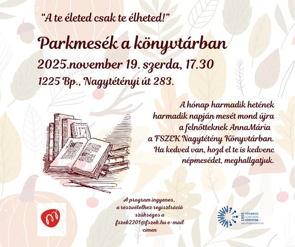 Programok Parkmesék a könyvtárban by nora.farmosi 2025.11.17. 2025.11.17. A Parkmesék ismét a téli lakhelyére költözik, mert ilyen időben nem csak a didergő király fázna a Nagytétényi Kastélyparkban. 2025. november 19-én szerdán 17.30-tól várják az érdeklődőket a FSZEK Nagytétényi Könyvtárban. Mert a mese a felnőtteknek is jár! FacebookEmail ELŐZŐ Őszi hangulat az óvodában – nagy sikerrel zárult a Családi Tökfaragó Verseny a Zöldecske tagóvodában KÖVETKEZŐ Smartie minden gazdi álma Olvasta már? Óránként indul a nosztalgiajárat a Móricz Zsigmond körtér... 2025.11.15. Szent Lipót Mese: Kubik Anna mesél a plébánián 2025.11.14. A kerületi könyvtárban is a rajzfilmeket ünneplik 2025.11.13.